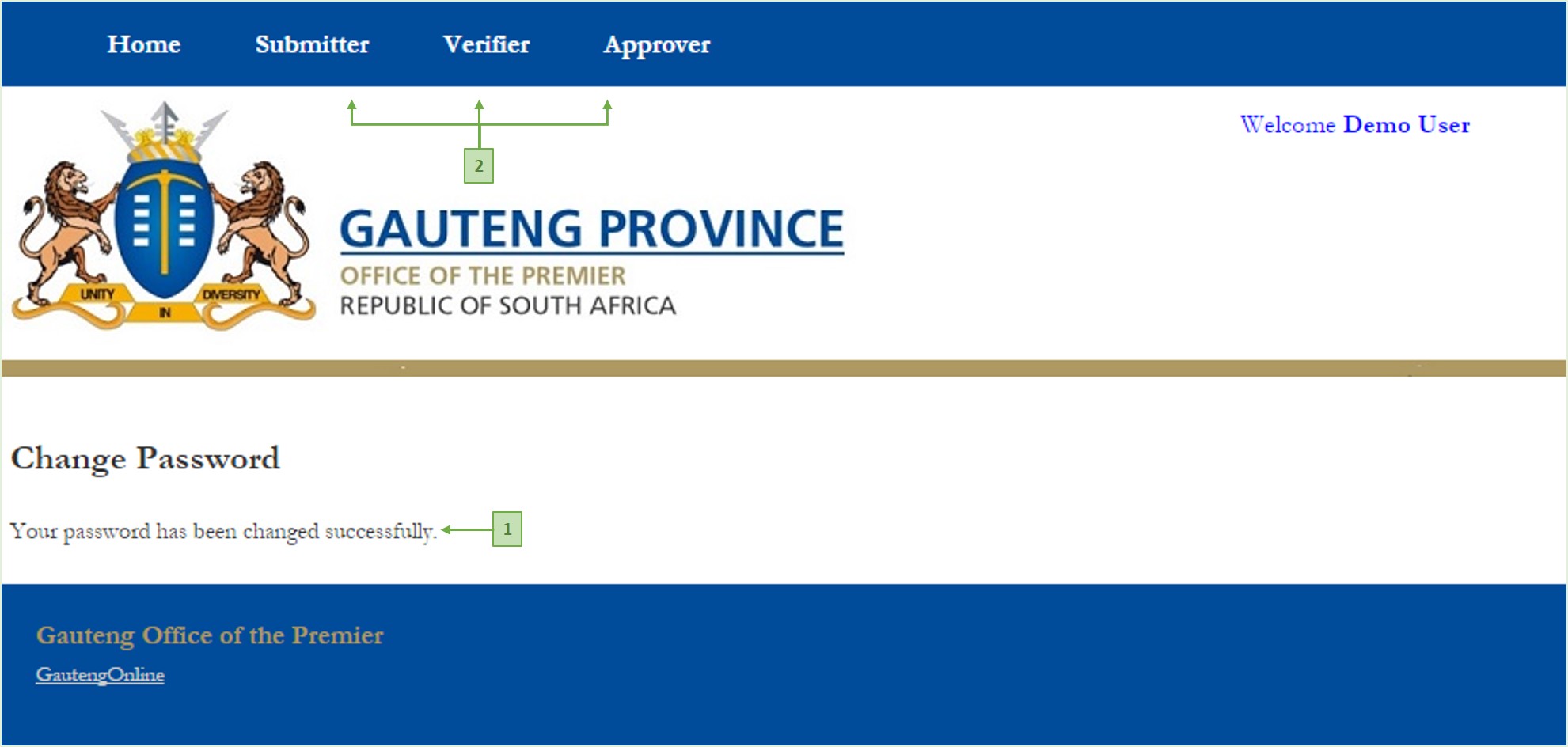 Once you have successfully changed your password (label 1 above), your user menu gets displayed on the menu bar at the top of the page (label 2 above ). Each of the menu items in the menu bar represents a role that has been assigned to you in the reporting process. Each menu item opens a Report Selection page, specific to the role it represents.