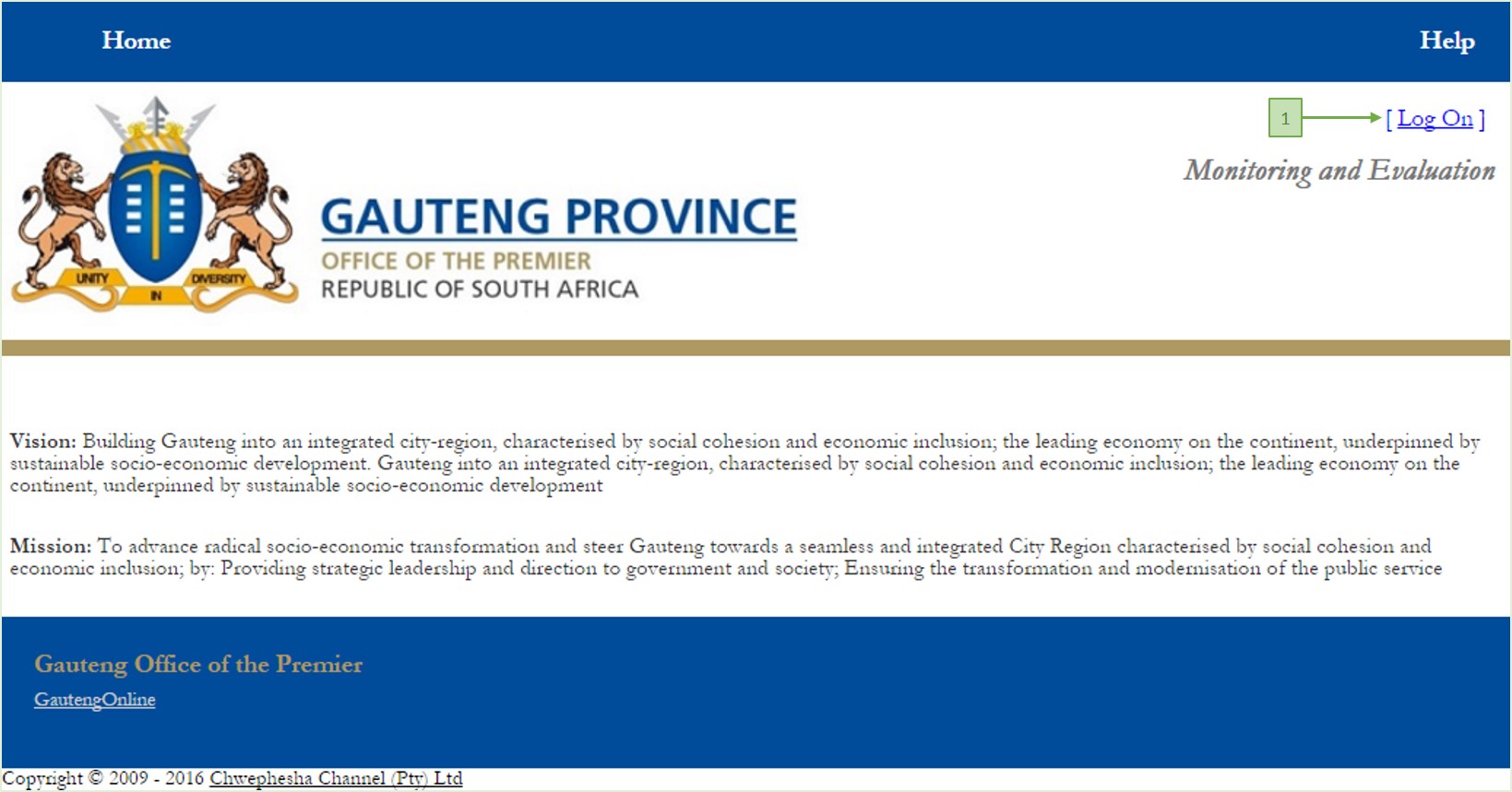 After launching the MERMS Web application (using the URL/web addres: www.merms.oop.gpg.gov.za) it opens on the landing page.