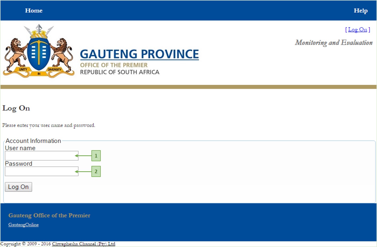 Once on the landing page, click on the Log On link (label 1 above). This opens the Log On page, as displayed by the image below